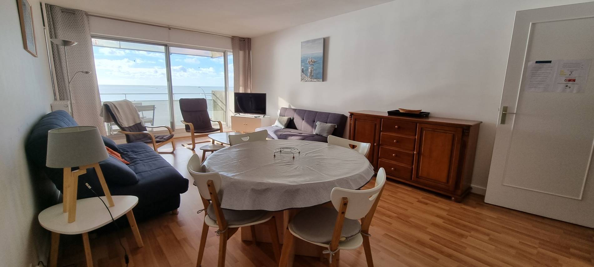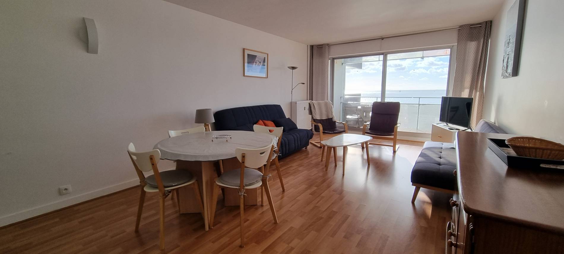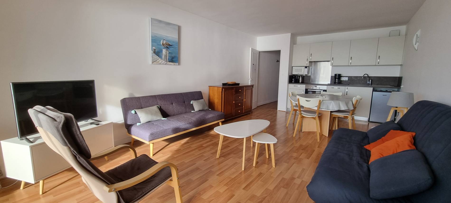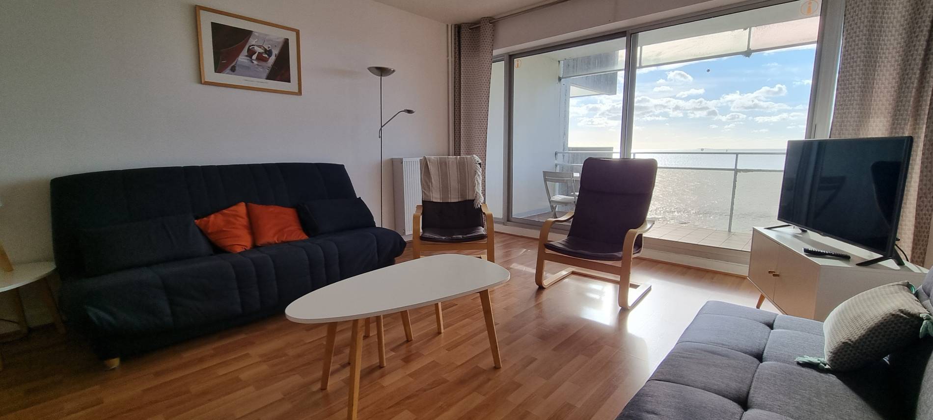 Coin Salon : Canapé convertible 2 personnes - table basse - parquet au sol - baie vitrée sur terrasse - banquette - TV écran plat