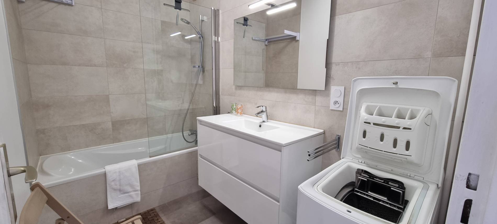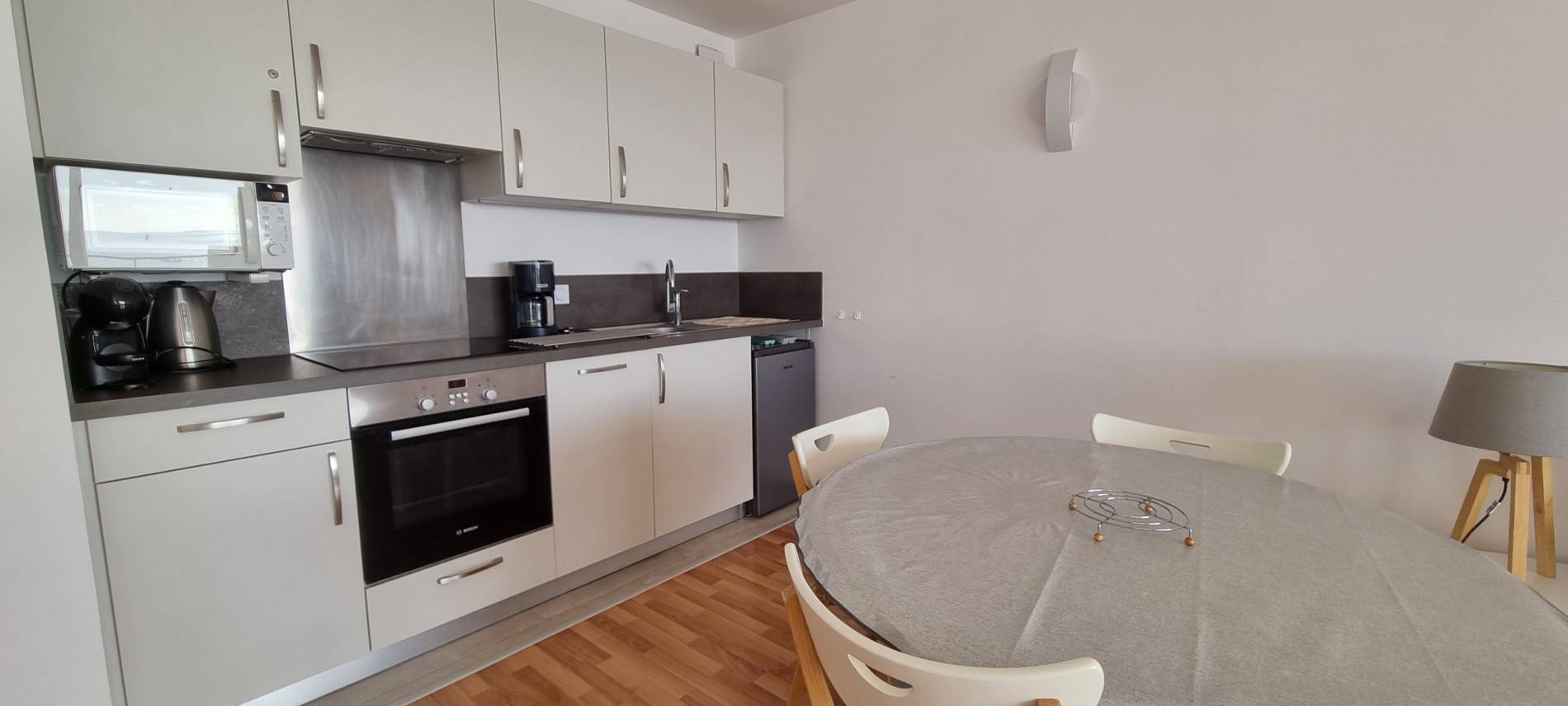 Séjour avec coin cuisine équipé : micro ondes - plaque induction - four électrique- petit réfrigérateur - Lave Vaisselle - Cafetière Nespresso Compatible - Grille-Pain - Table - chaises -