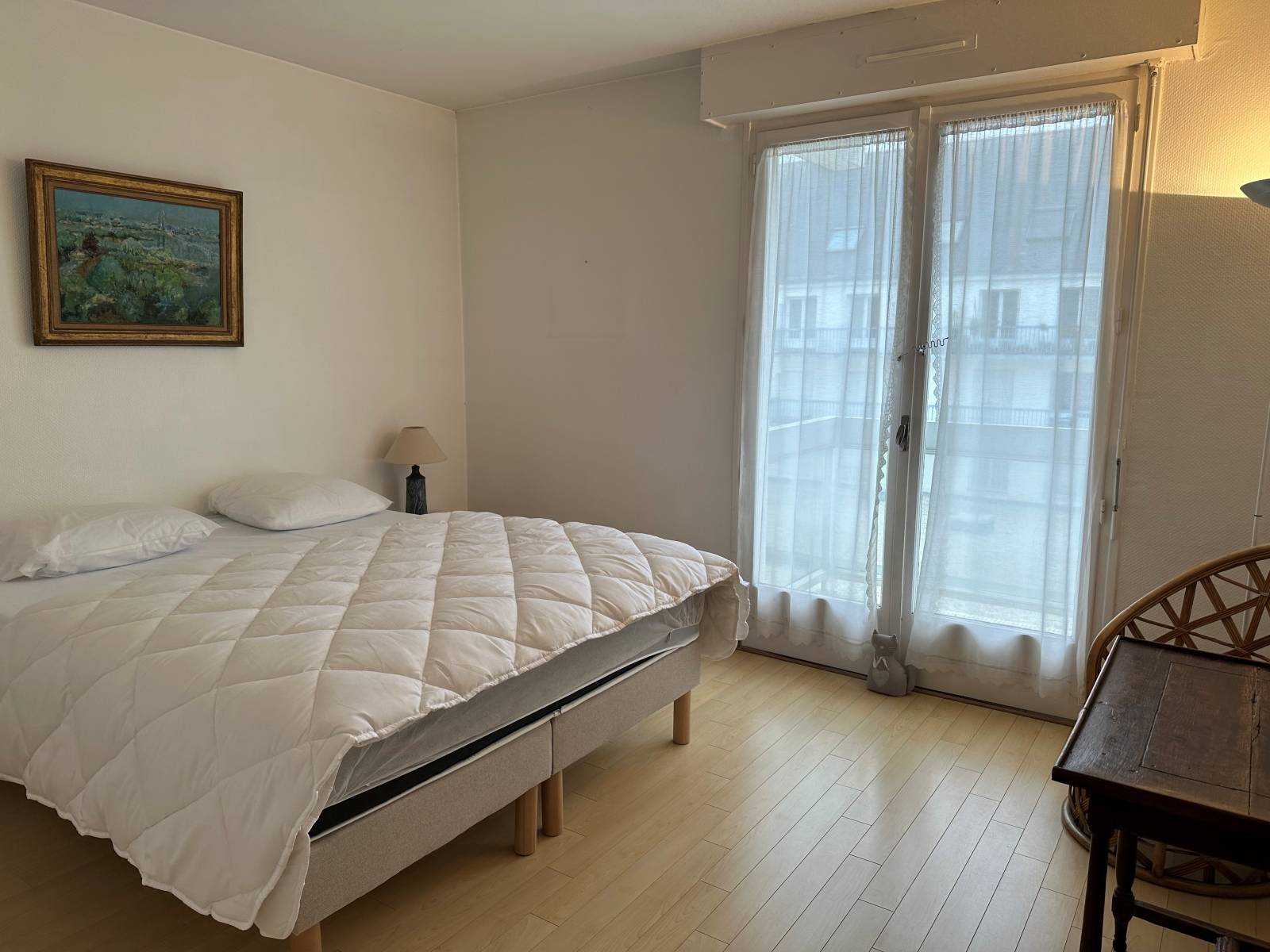 Chambre : 1 lit 160cm – parquet au sol – placard/penderie – balcon vue arrière