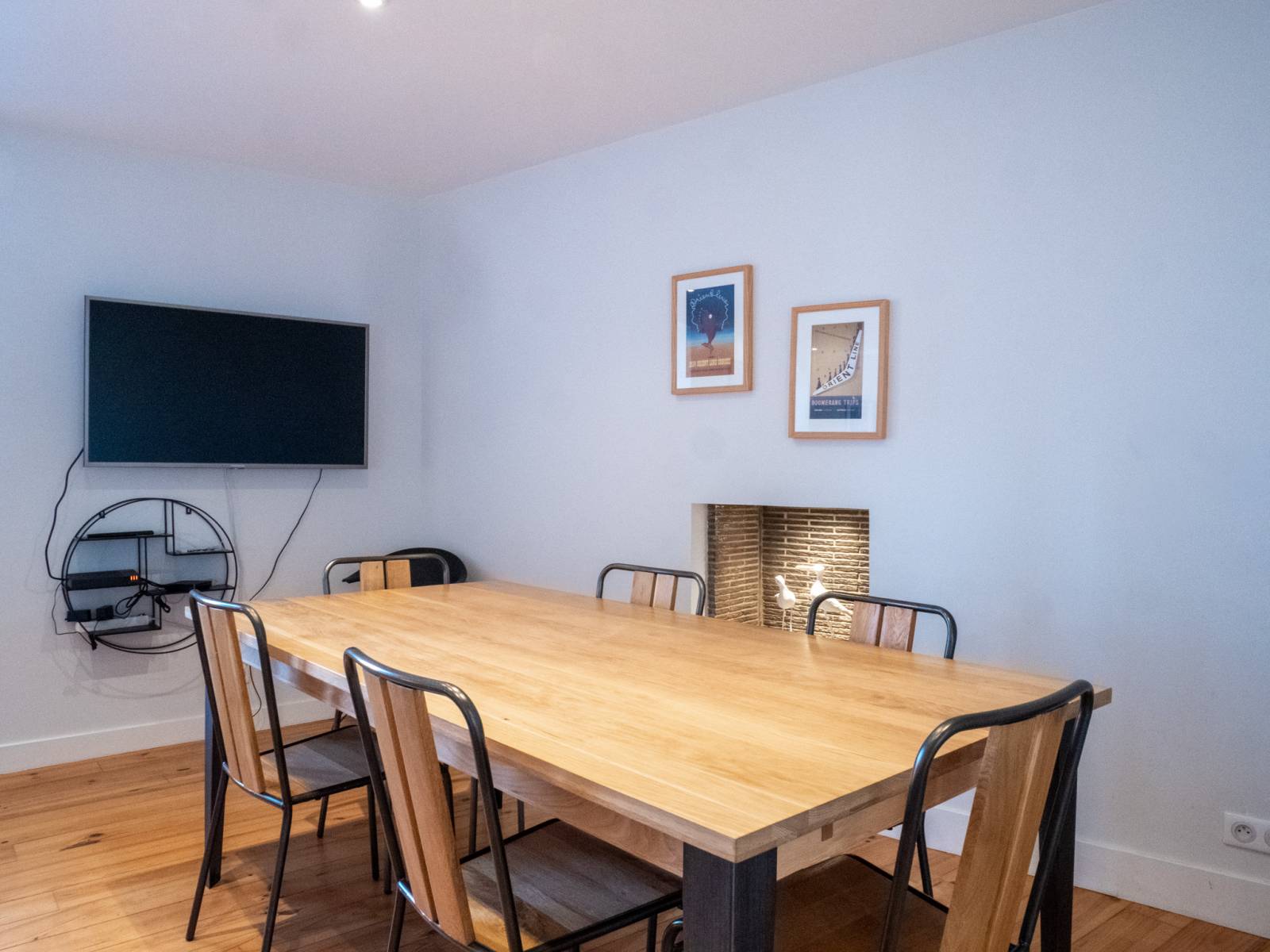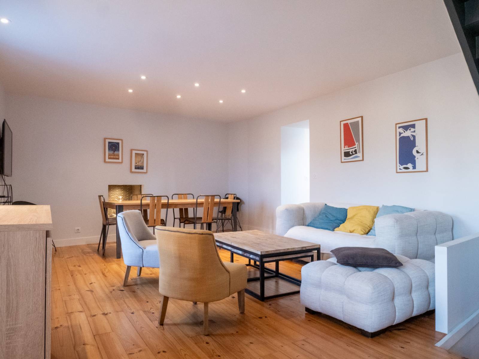 1er étage : Grand Salon/séjour avec fenêtres sur chenal – table et chaises – canapé – fauteuils – table basse – TV Murale – sol parquet