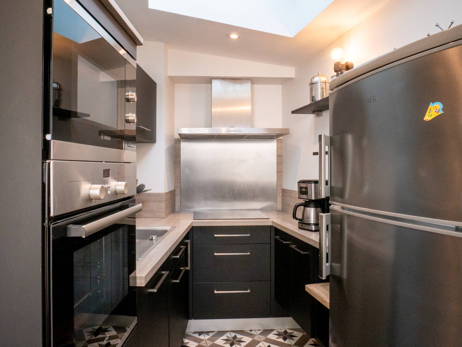 Cuisine équipée (sous vérrière) : four – micro ondes – lave vaisselle réfrigérateur – plaque vitro céramique – Cafetière à filtre - Grille-pain - rangements –