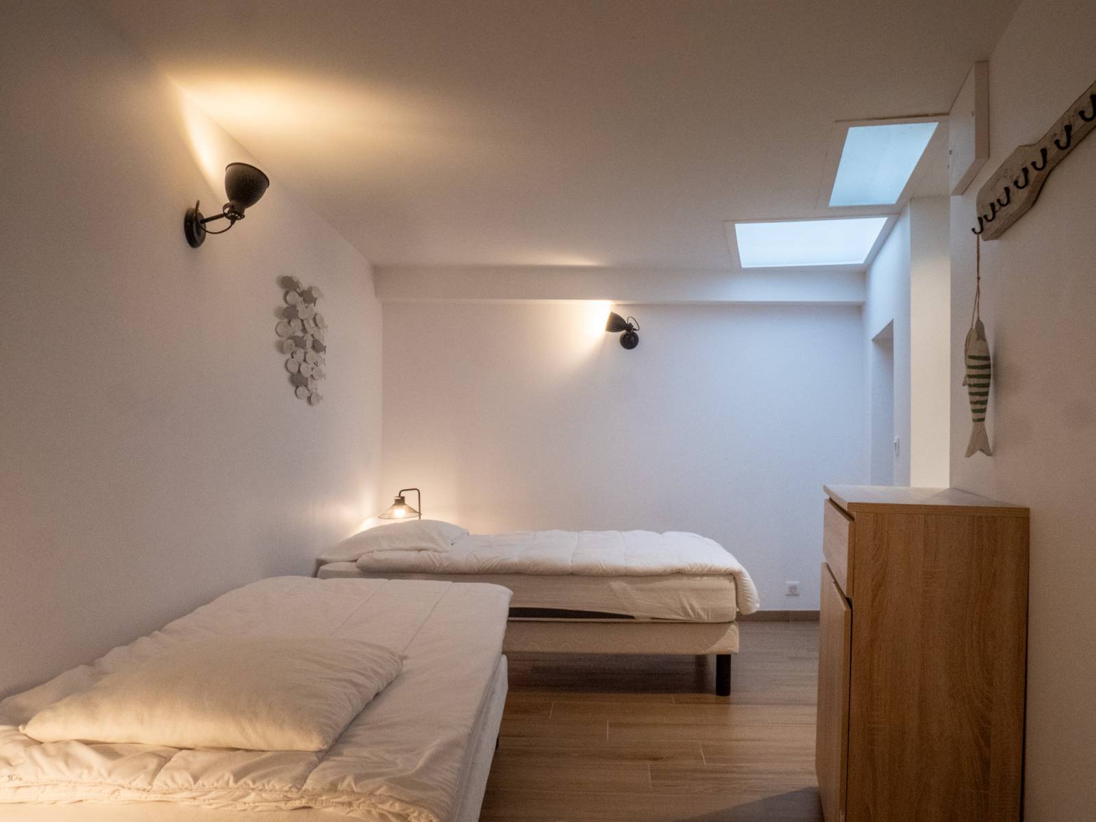 Chambre : 2 lits 90cm – rangement – carrelage imitation parquet – 2 puits de lumière au plafond pour éclairage naturel (ne s'ouvrent pas)