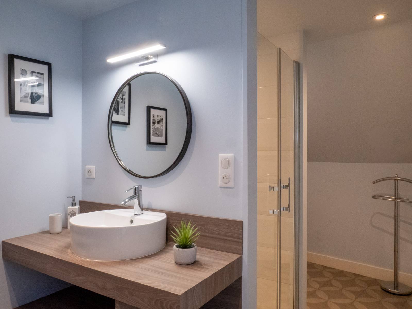 Salle d’eau : Vasque – douche à l’italienne – sèche serviettes – rangement