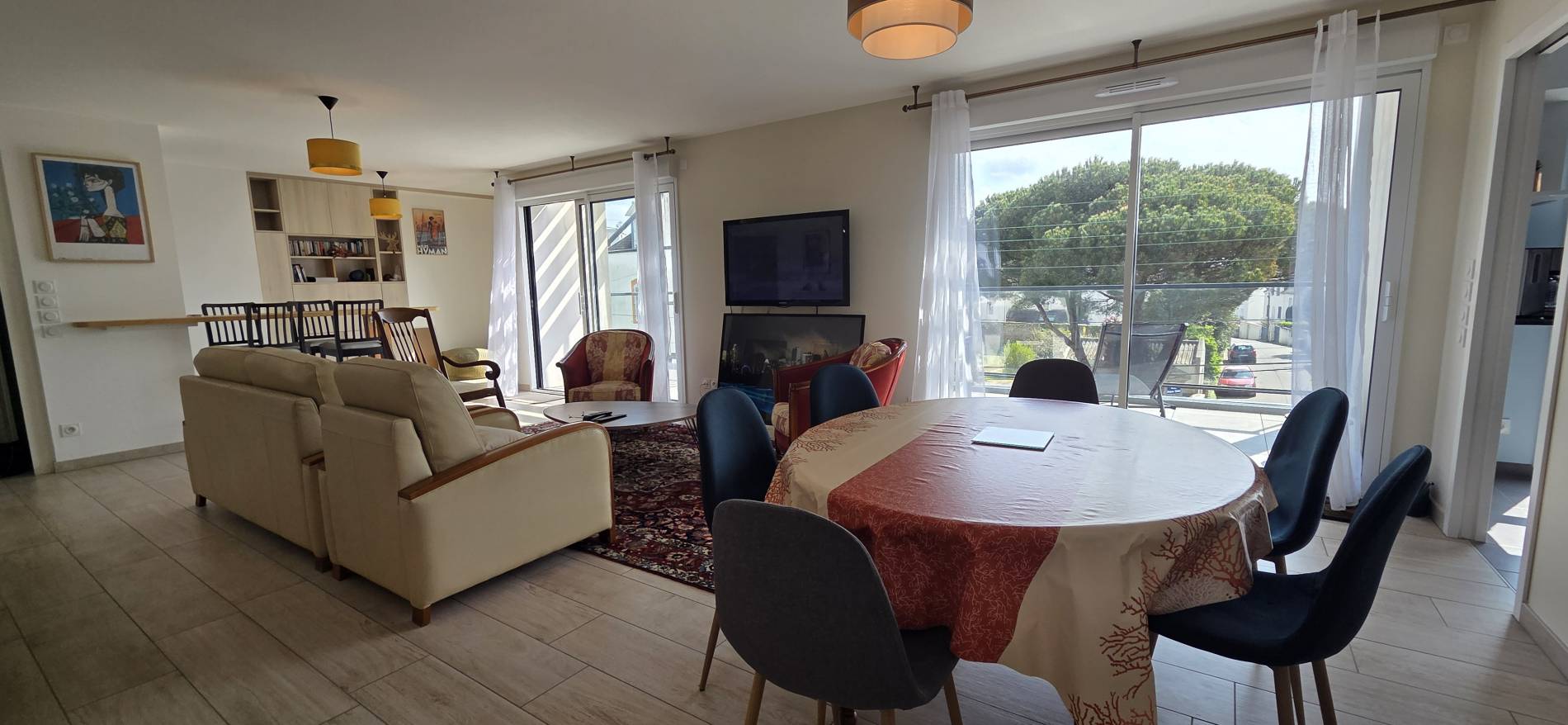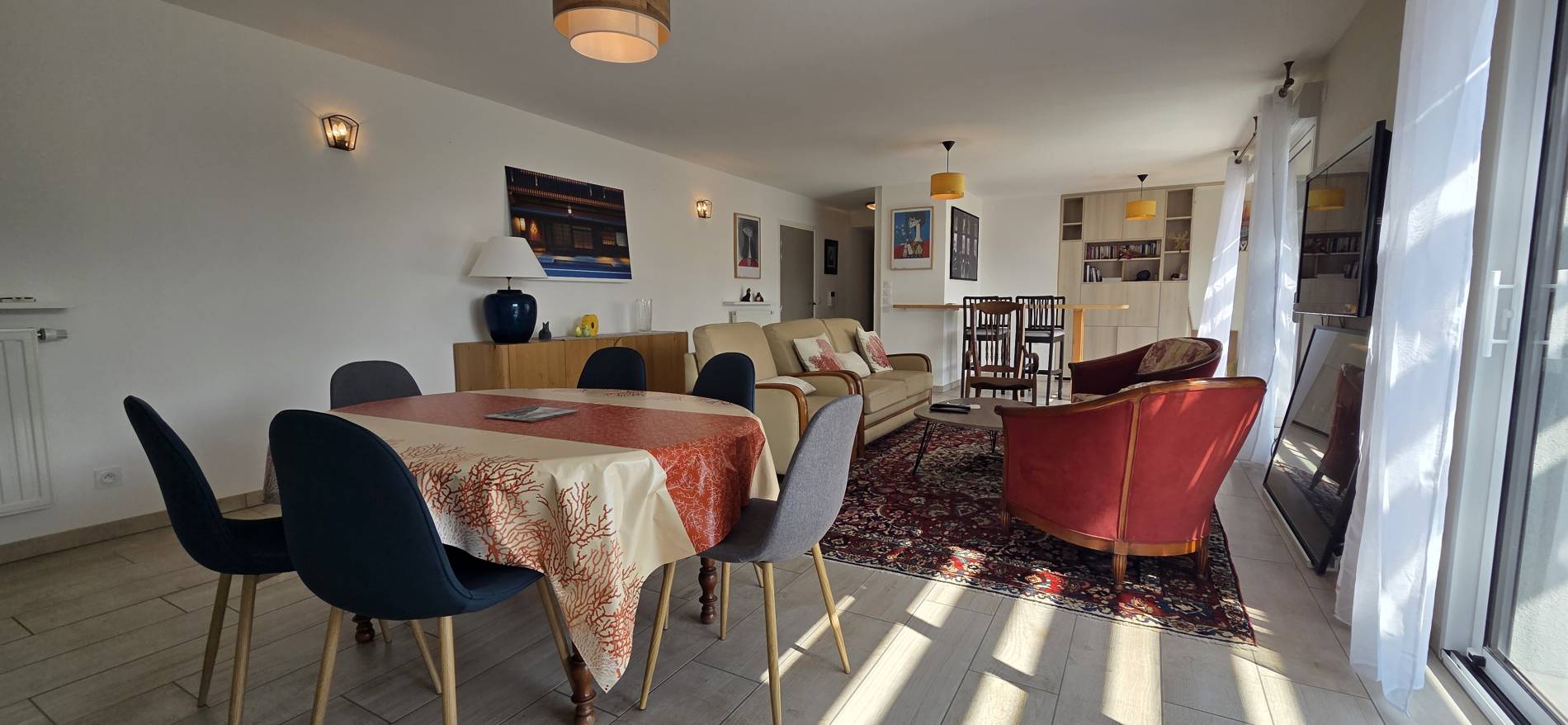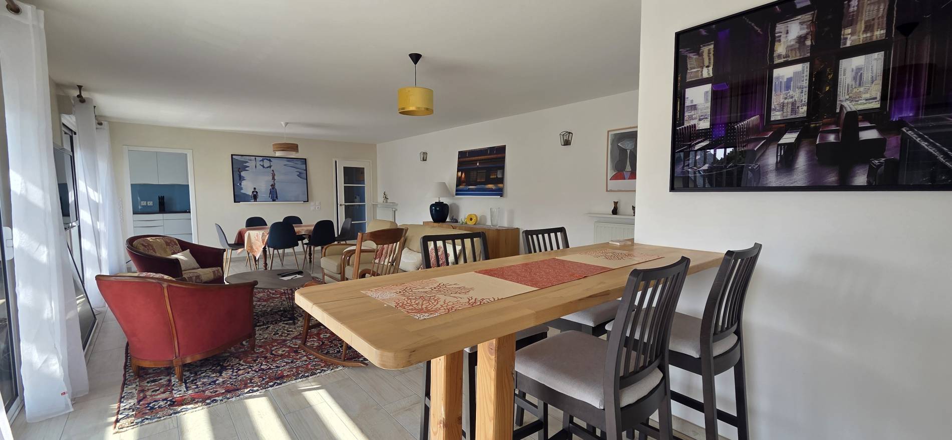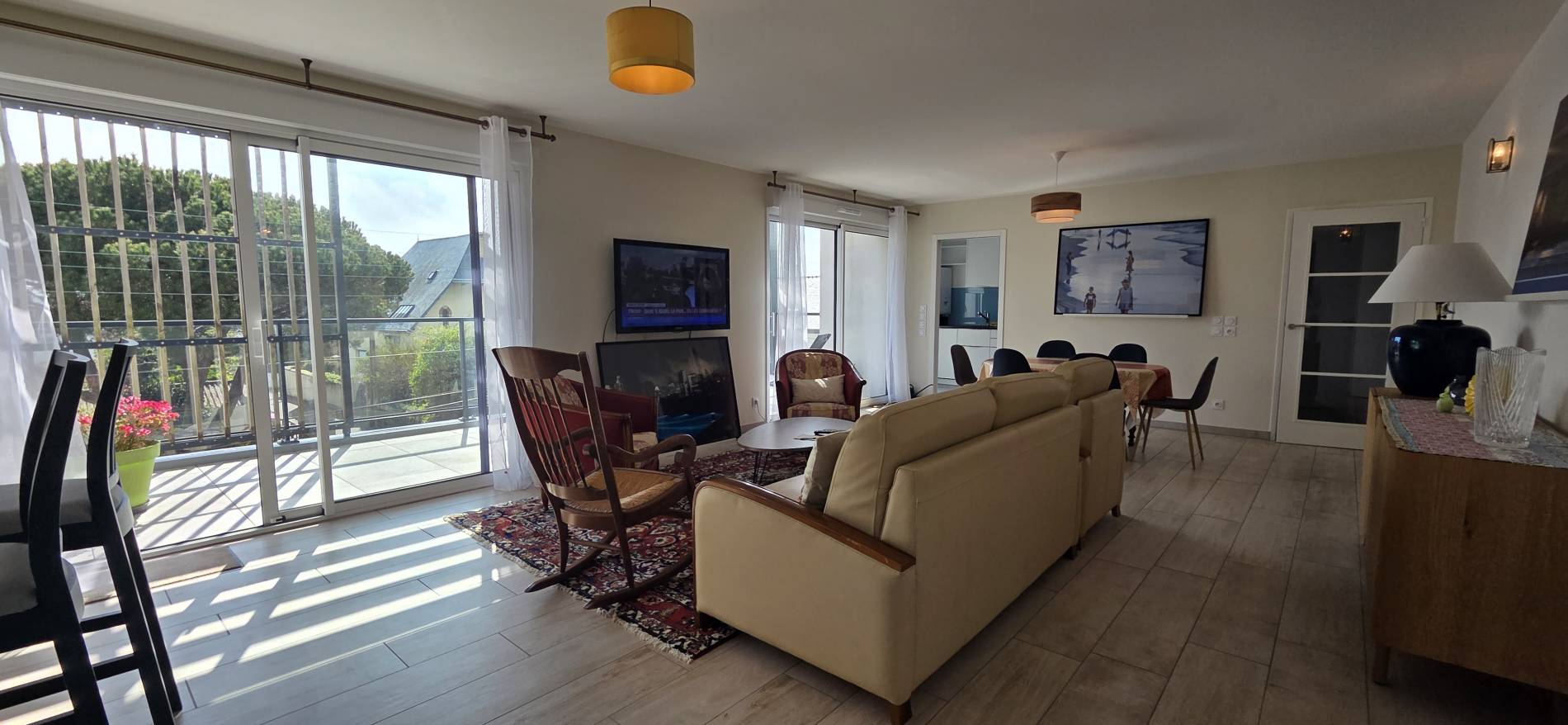 Salon/séjour: Bel espace de 45m² avec entrée et placard dans lequel se trouvent une machine à laver et un sèche linge - Un coin bar avec une table, 4 tabourets, un fauteuil et un meuble de rangement avec planche et fer à repasser à l’intérieur - baie vitrée donnant sur la terrasse - canapé - 2 fauteuils - une table basse - Rocking chair - TV - décodeur TV - coin repas avec 1 table et 6 chaises