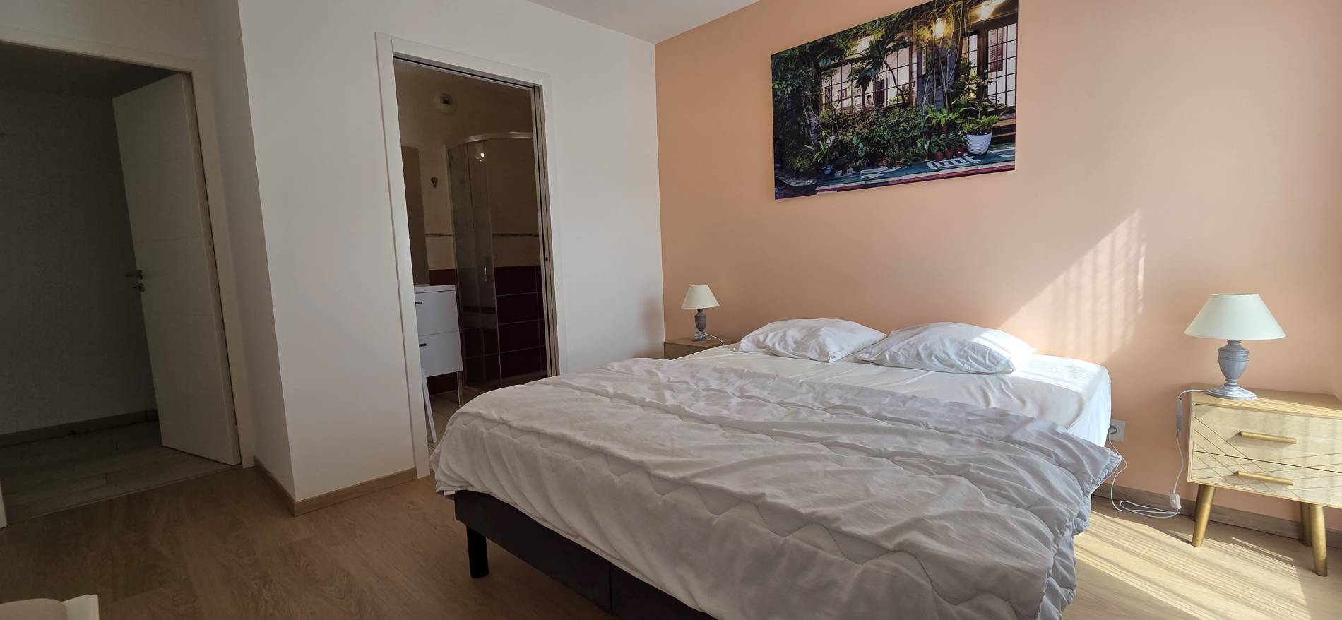 Chambre 1 avec salle de bain attenante: 1 lit de 160x200cm - placard - penderie - banc - 2 tables de chevet - 2 lampes - fenêtre