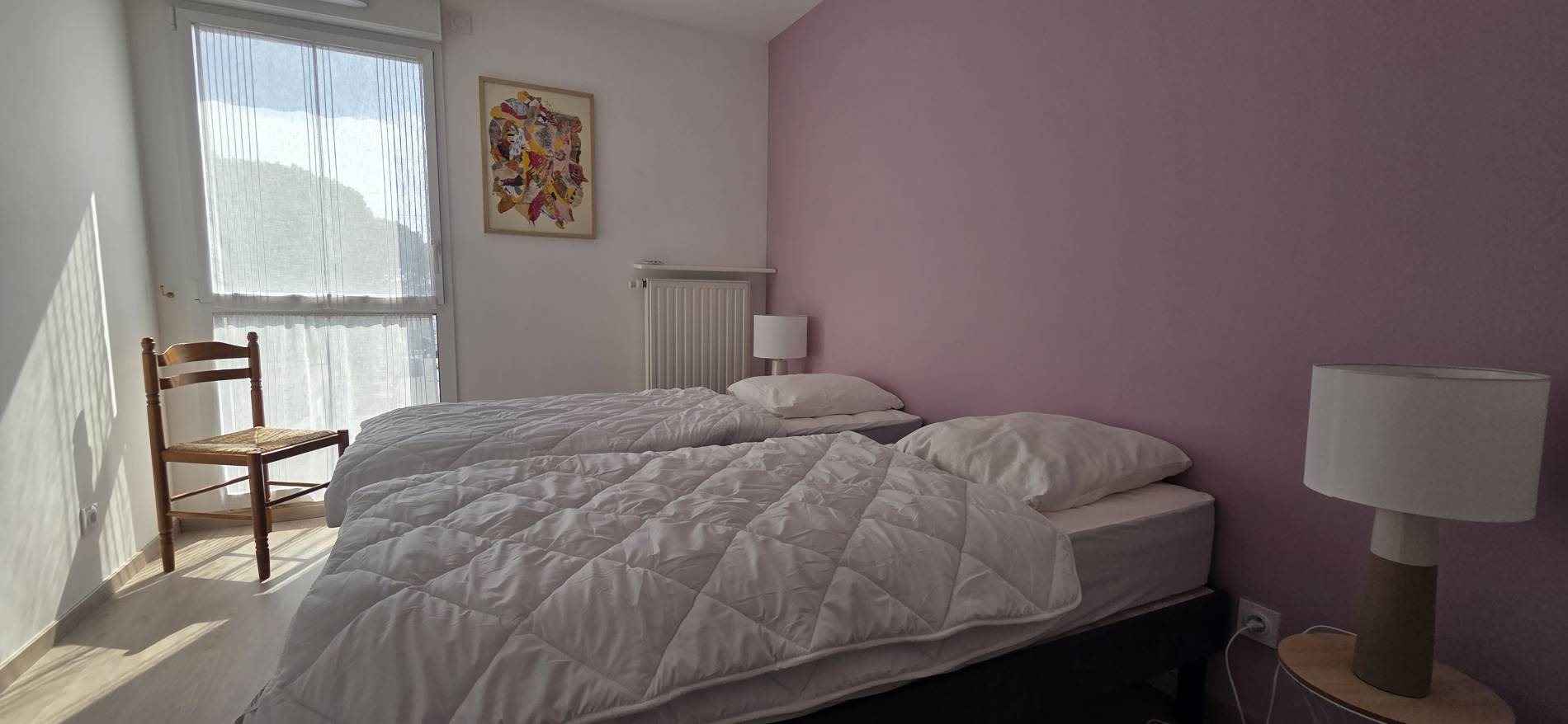 Chambre 2: 2 lits de 80x190cm - placard - 2 tables de chevet - 2 lampes - fenêtre