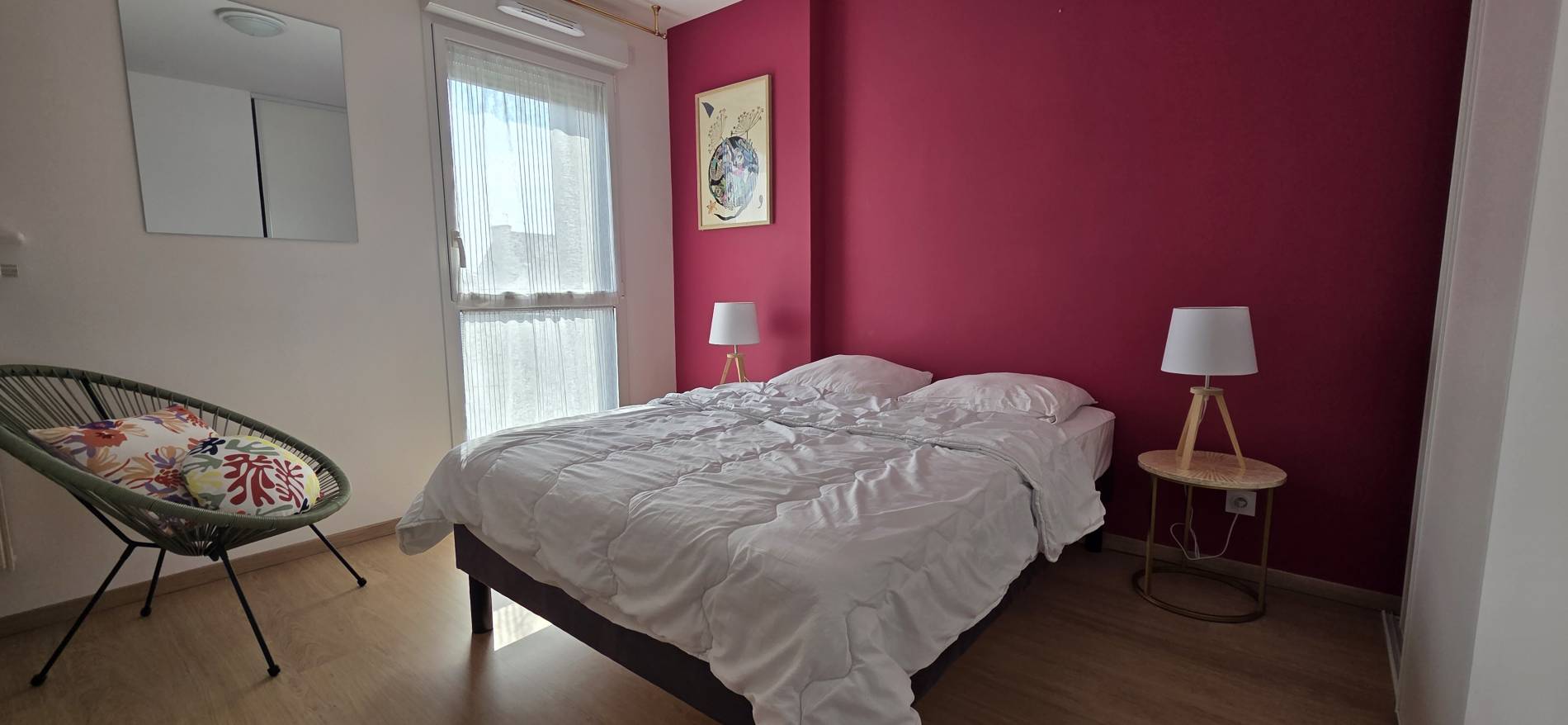 Chambre 3: 1 lit de 140x190cm - placard - penderie - 2 tables de chevet - 2 lampes - fenêtre
