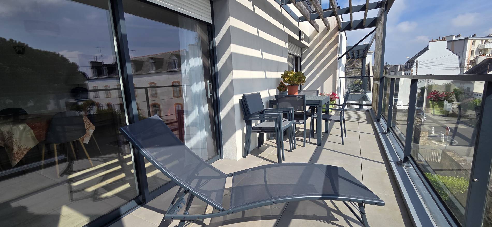 Terrasse de 13.5m²: 1 table - 6 chaises d’extérieur - 2 chiliennes - éclairage - vue mer latérale
