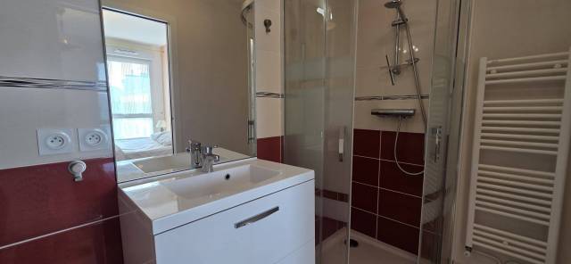 Salle de bain 1: Douche - meuble de rangements avec simple vasque - miroir