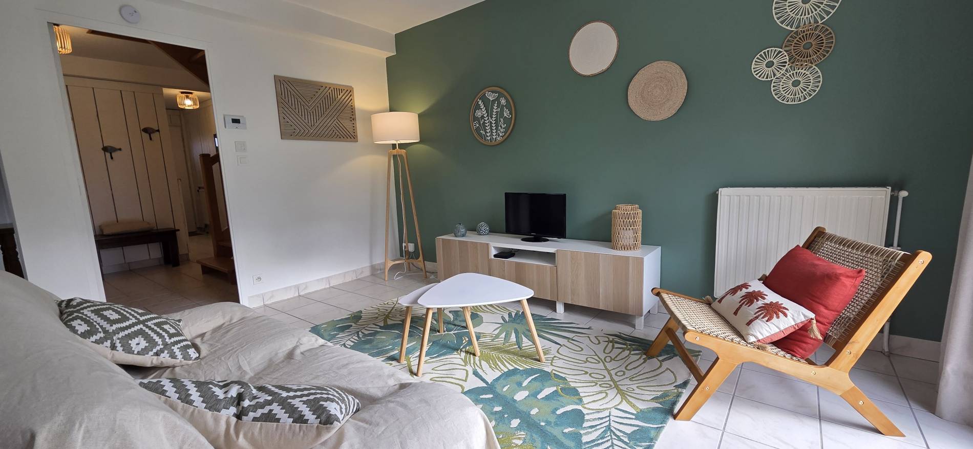 Coin Salon avec Canapé – Meuble TV avec TV – Table Basse – Petit Fauteuil – Portes Fenêtres donnant sur la Terrasse et le Jardin