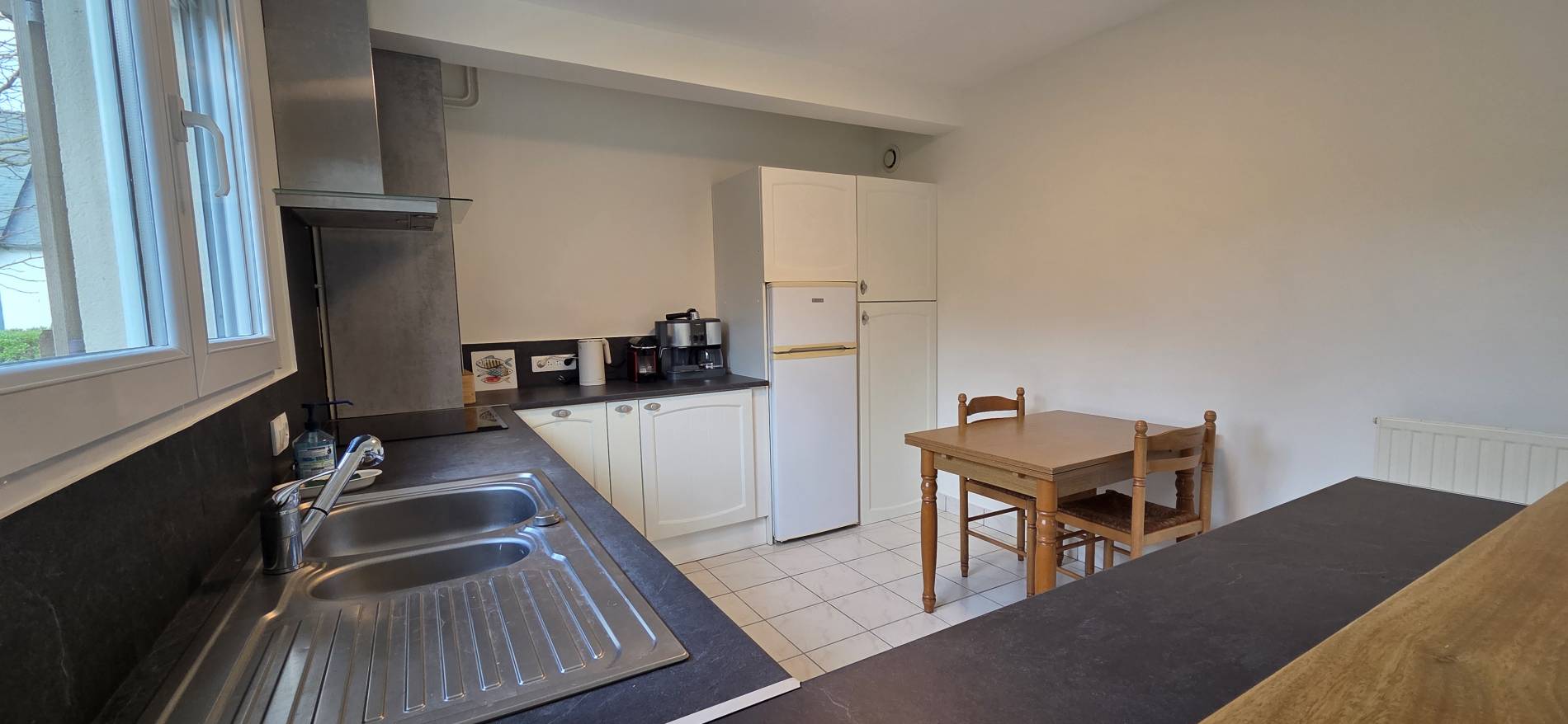 Coin Cuisine avec Plaque Induction – Réfrigérateur avec compartiment Congélateur – Four Electrique – Lave-Vaisselle - Cafetière – Bouilloire – Grille-Pain – Table avec 2 Chaises - Cafetière Filtre et Cafetière Nespresso