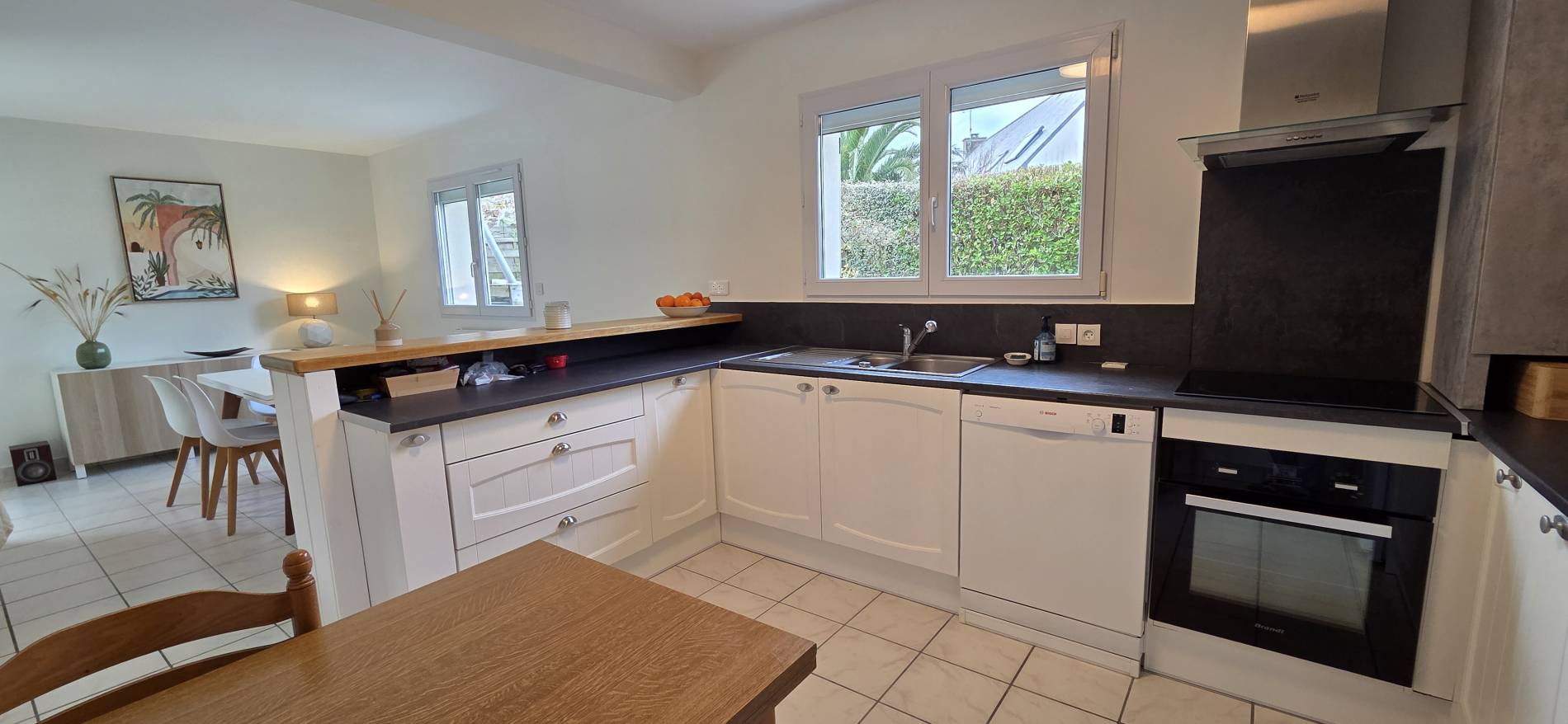 Coin salle à manger avec Tables et 6 Chaises – Vaisselier – Fenêtre donnant sur le Jardin
