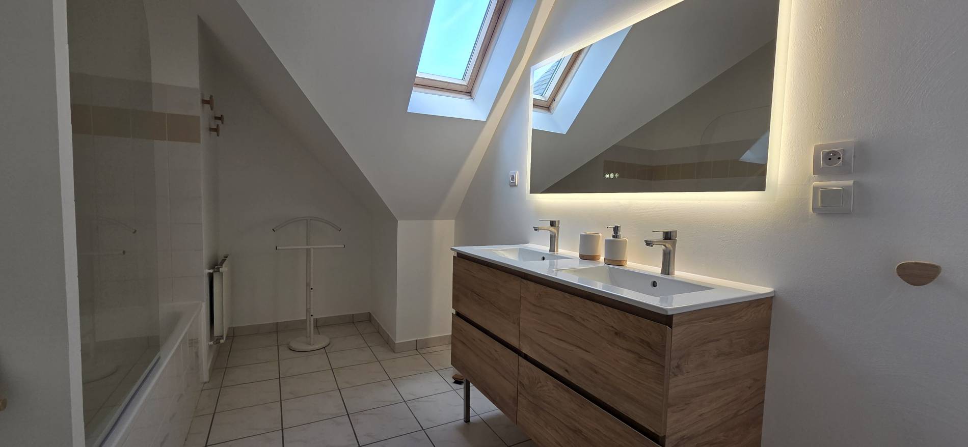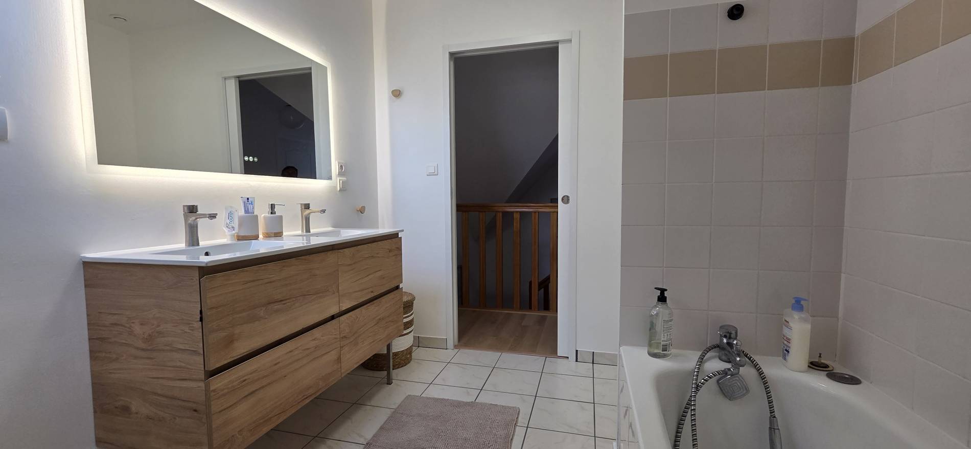 Salle de bain : Baignoire/Douche – WC – Meuble Double vasque – Miroir