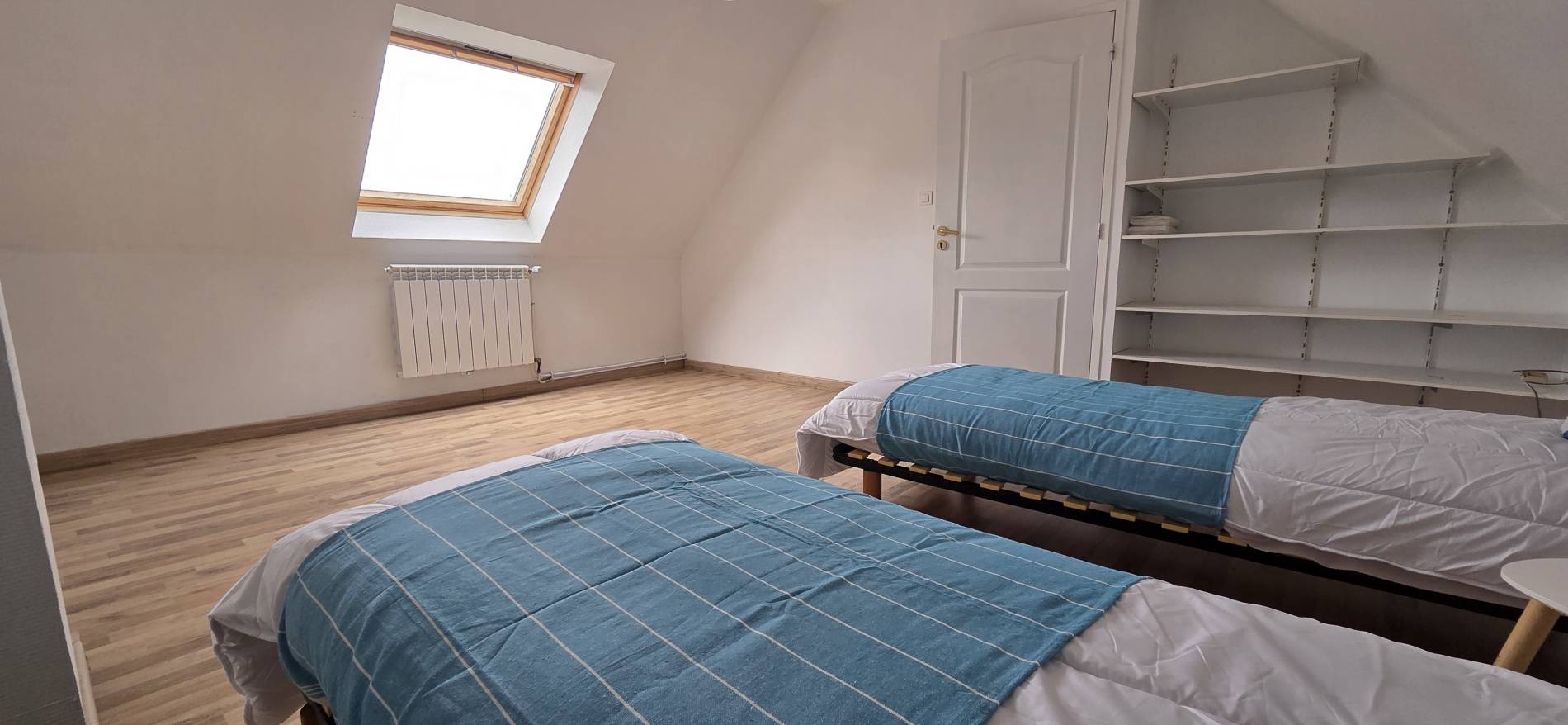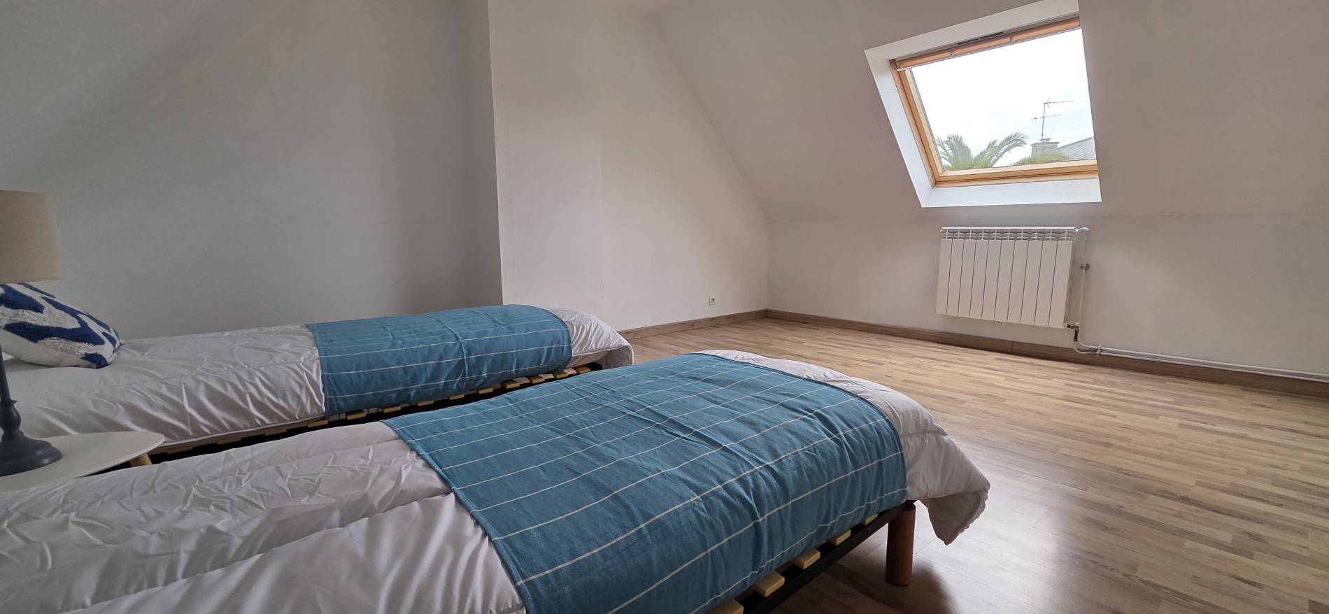 1ère Chambre : 2 lits 80cm – Rangement – Penderie - Table de Chevet – Vélux donnant sur le Jardin
