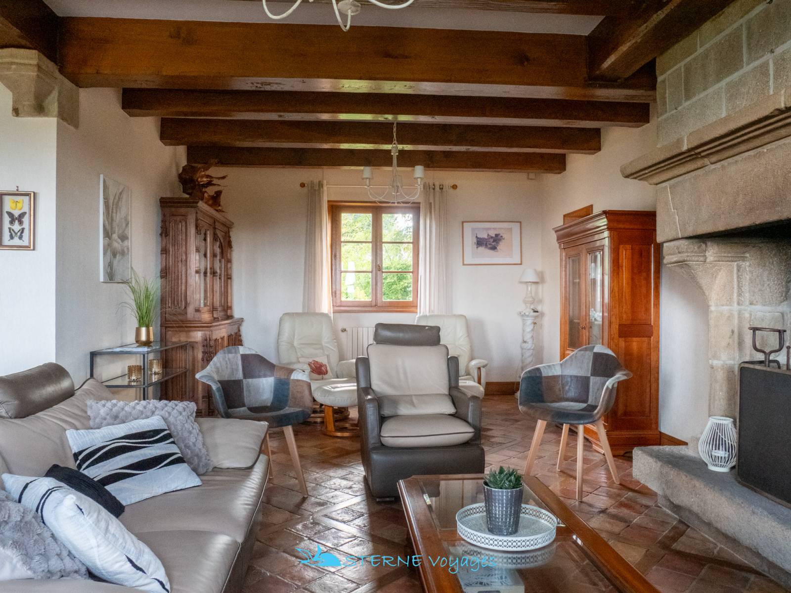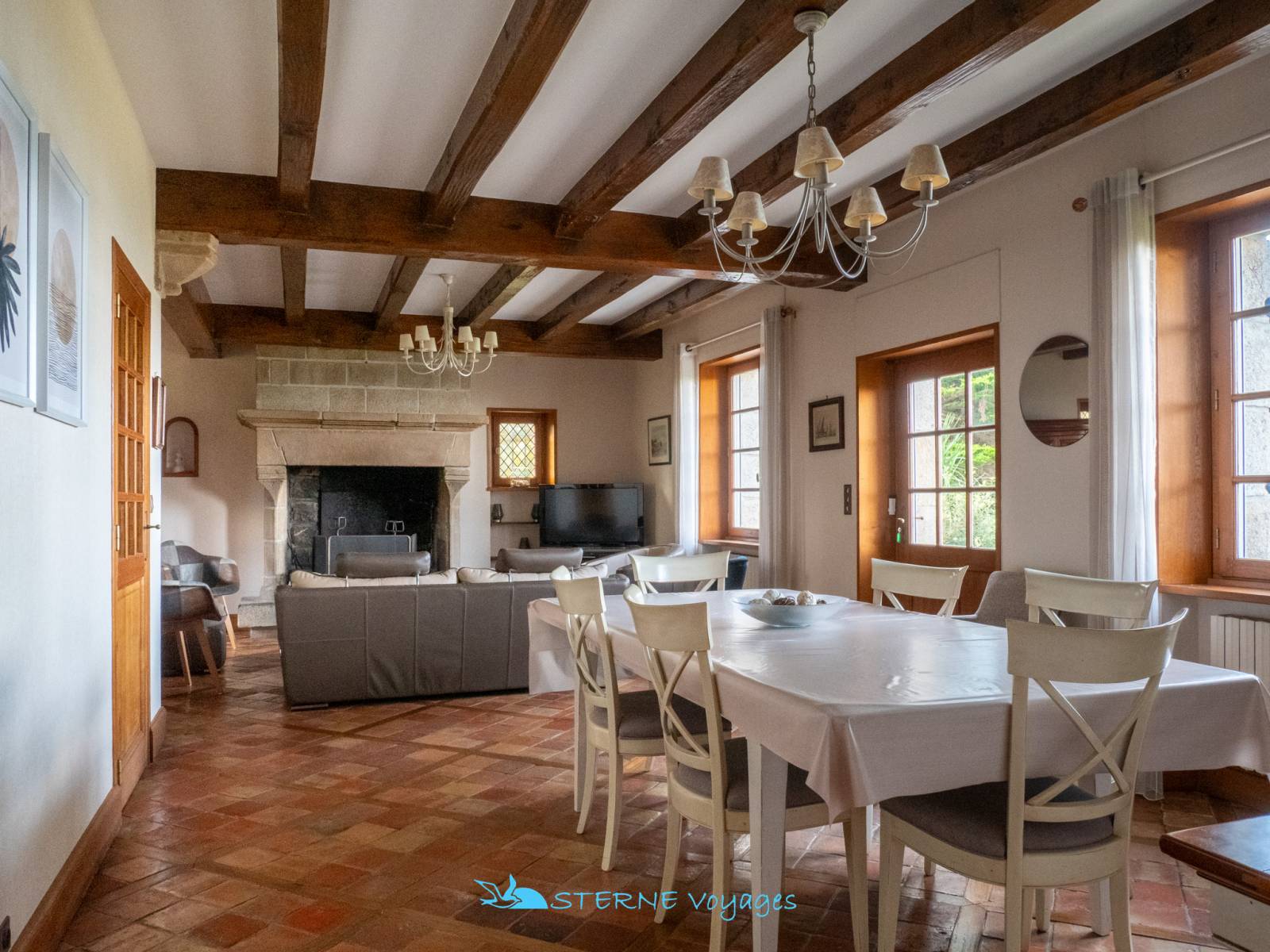 Coin Salon : Fauteuils – Canapé – Chaises – Meuble TV – TV – Table Basse – Console – Meubles Bretons – Fenêtre donnant sur le Jardin et la Mer