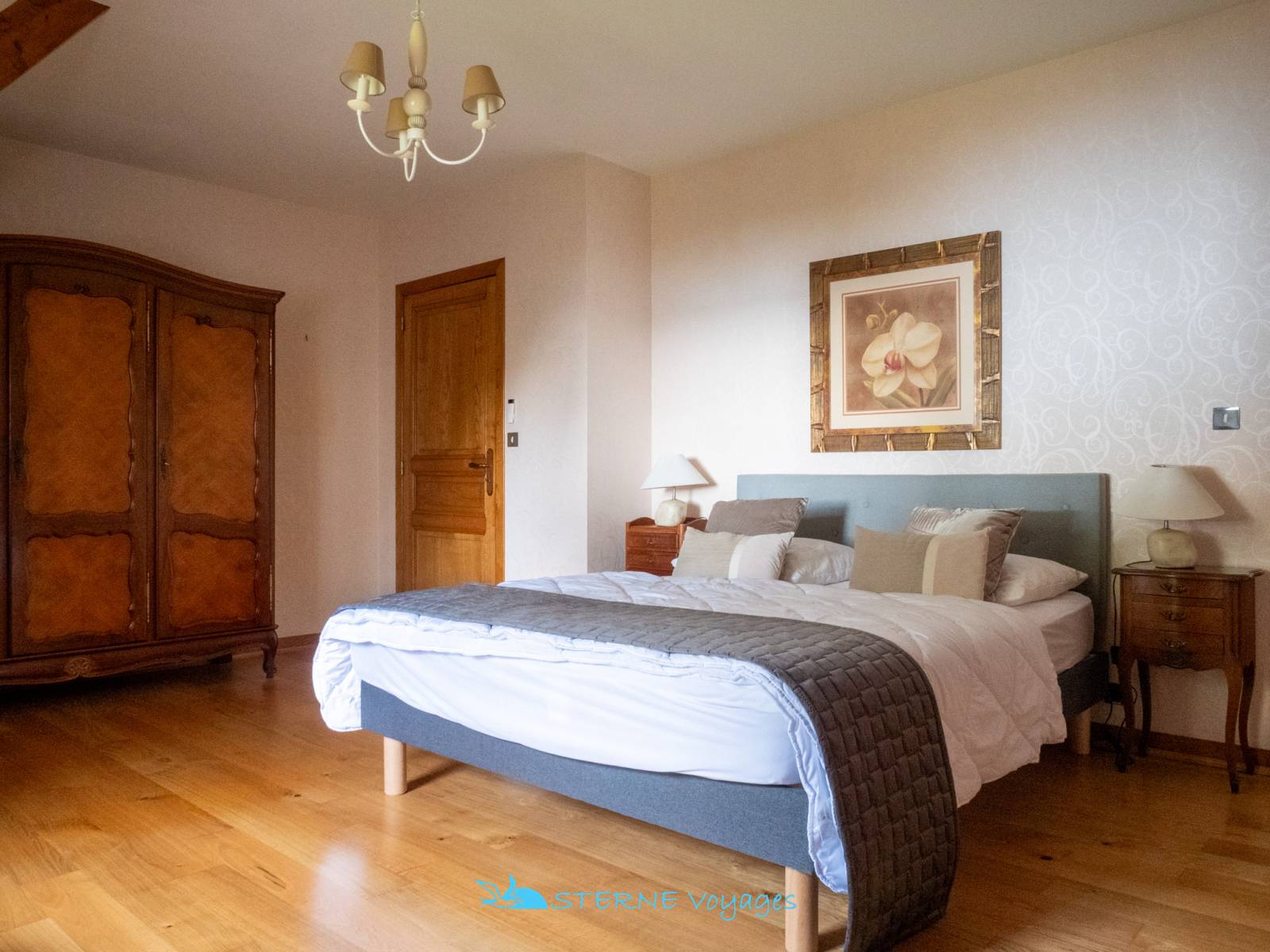 Chambre parentale avec salle de bain attenante : Lit 160cm – Fauteuils – Miroir – Armoire – Table de Chevets – Fenêtre – Vue mer