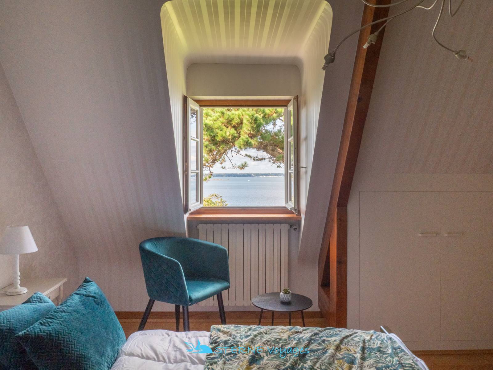 3ème Chambre : Lit 140cm – Fauteuils – Armoire – Tables de chevet – Fenêtre – Vue mer