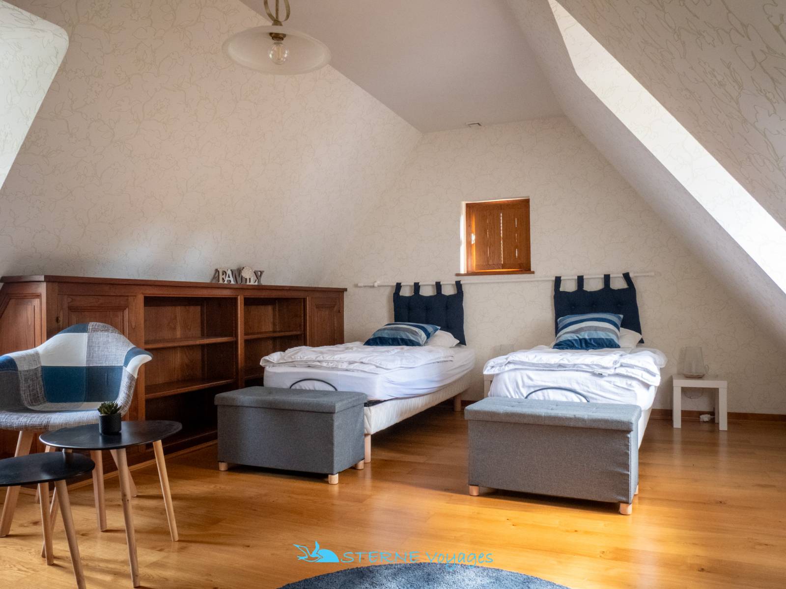 4ème Chambre (2 Marches pour y accéder) : 2 lits 80cm – Fauteuils – Rangements – Fenêtres – Vue jardin